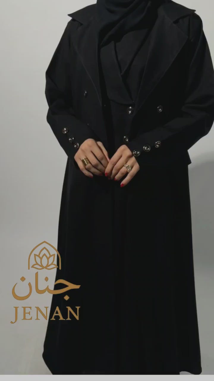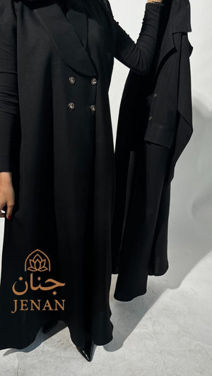 العباية مكوّنة من قطعتين فاخرتين من قماش انسيابي واقف يجمع بين الخفة في اللبس والفخامة في اللمسة. تصميم القطعة الداخلية يعطي ثبات وأناقة إضافية، بينما القطعة الخارجية تنسدل بانسيابية تخليك تطلعين بإطلالة قوية بدون أي مجهود.