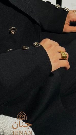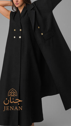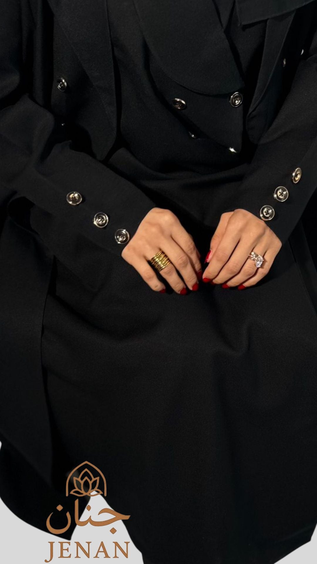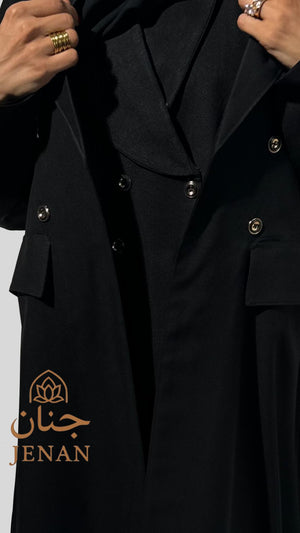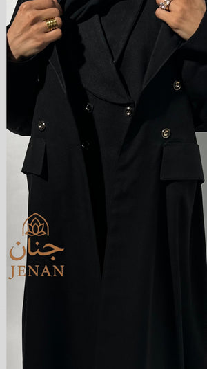 تتزيّن العباية بأزرار ذهبية أمامية ولمسات ملكية على الأكمام، مستوحاة من أسلوب راقٍ يناسب ذوق المرأة الواثقة. تفاصيلها الناعمة مع قصّتها الطويلة تمنحك ظهور مميز بكل خطوة—إطلالة مو بس أنيقة… إطلالة تبقى! ✨