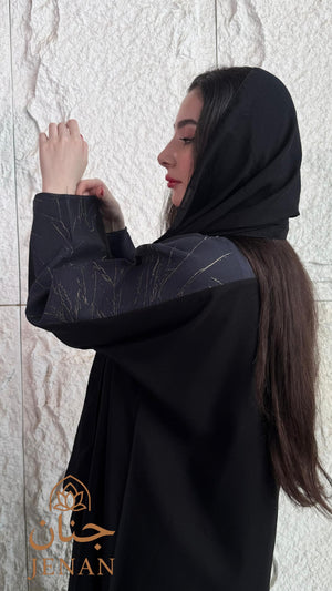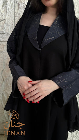 اللون : أسود عميق ثابت مع أكمام وياقة باللون الأزرق الداكن مع تموجات ذهبية انيقة